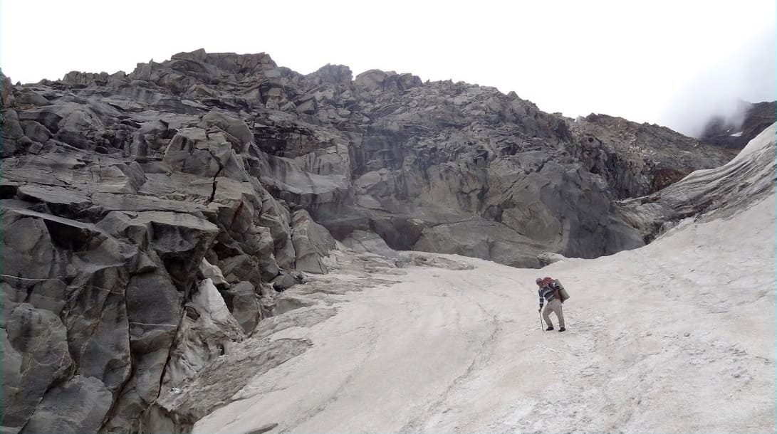 The entire snowfield was crevassed, but mostly the crevasses were open and hence easily avoidable. The climb to the pass was a steep rockface and needed rock climbing skills. The initial 10-15M seemed the hardest.