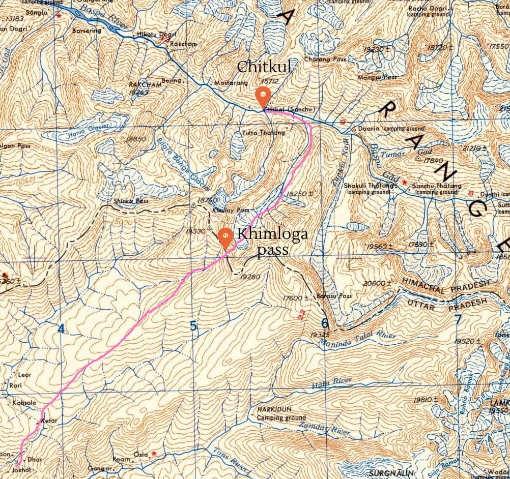 Khimloga or Khimlay pass; it is no longer used by the Shepherds and traders. It is an old trade route between Lewari (Uttarakhand) and Chitkul in the Baspa Valley or Sangla Valley.