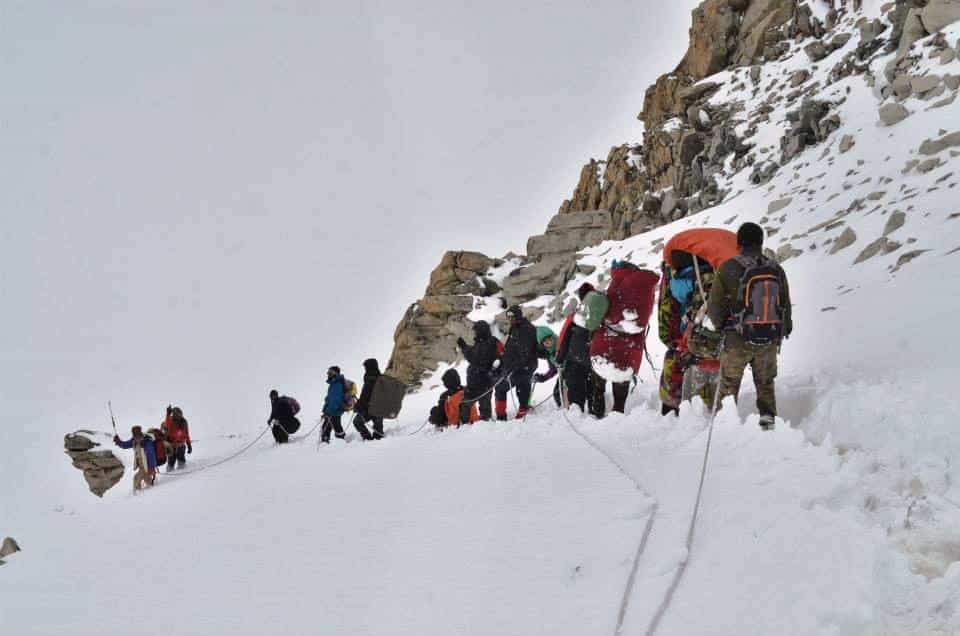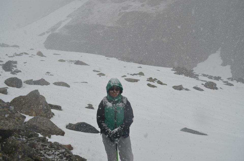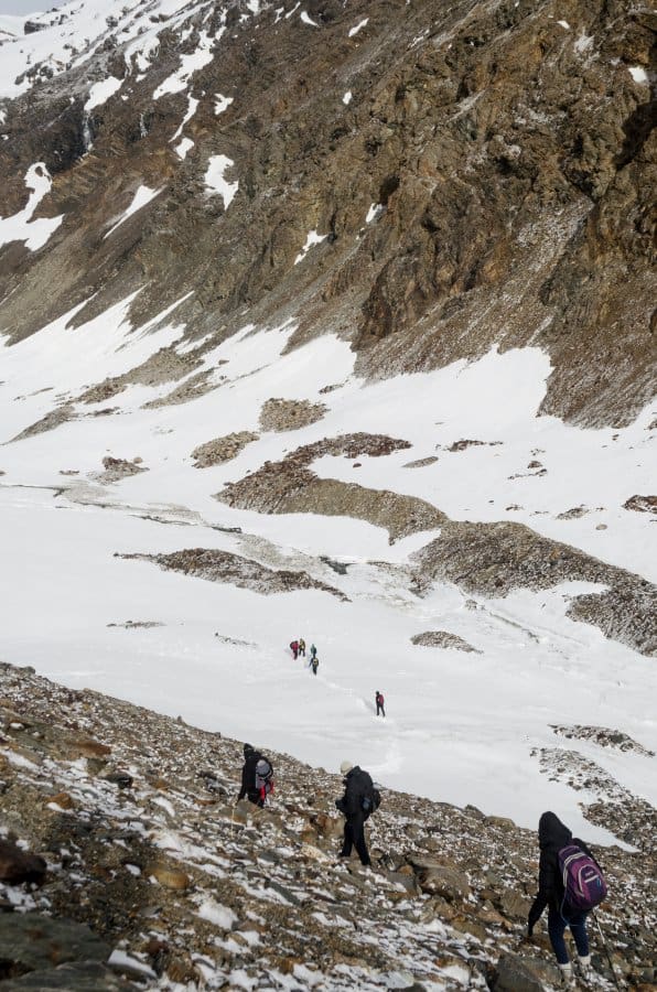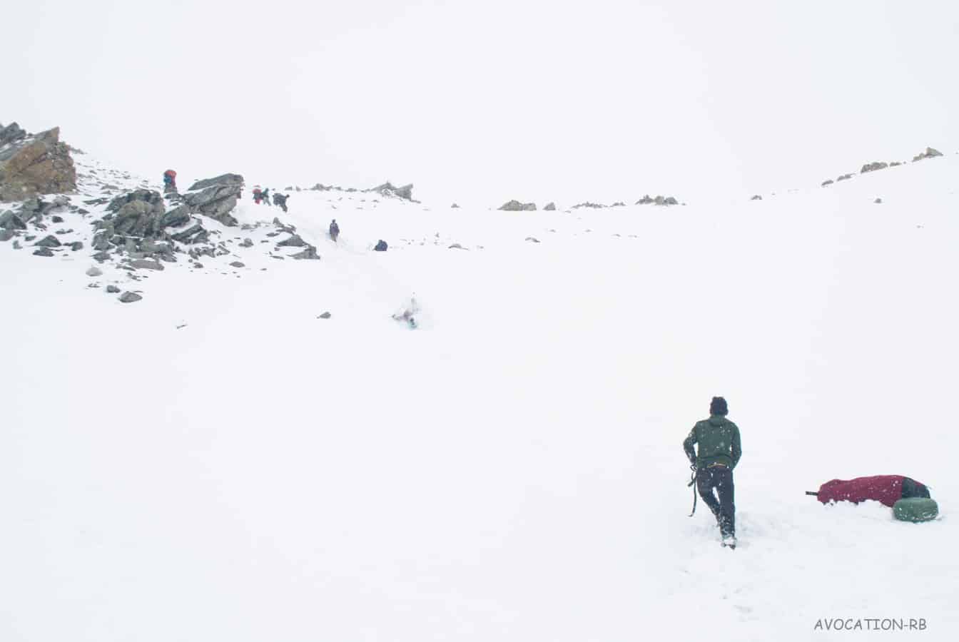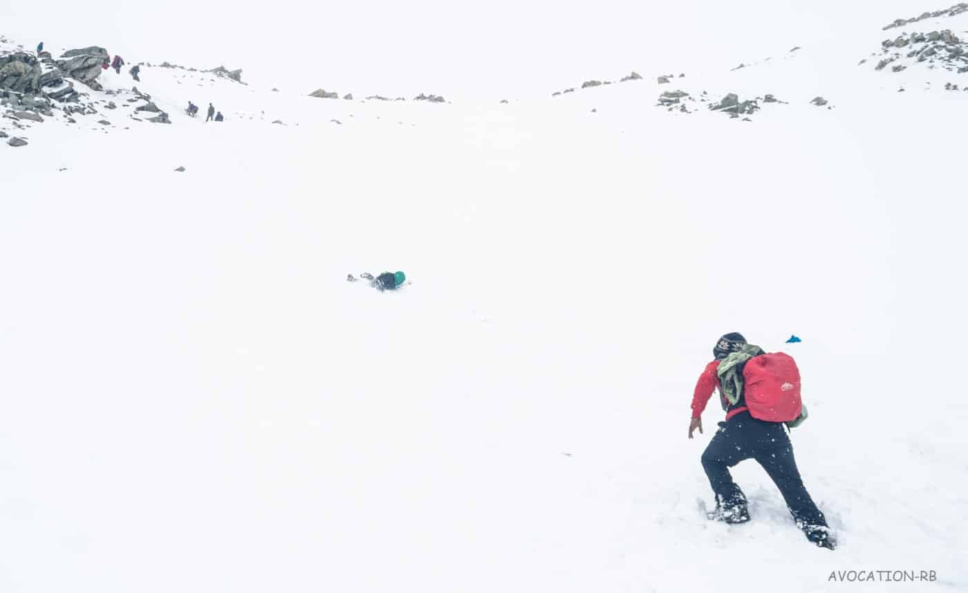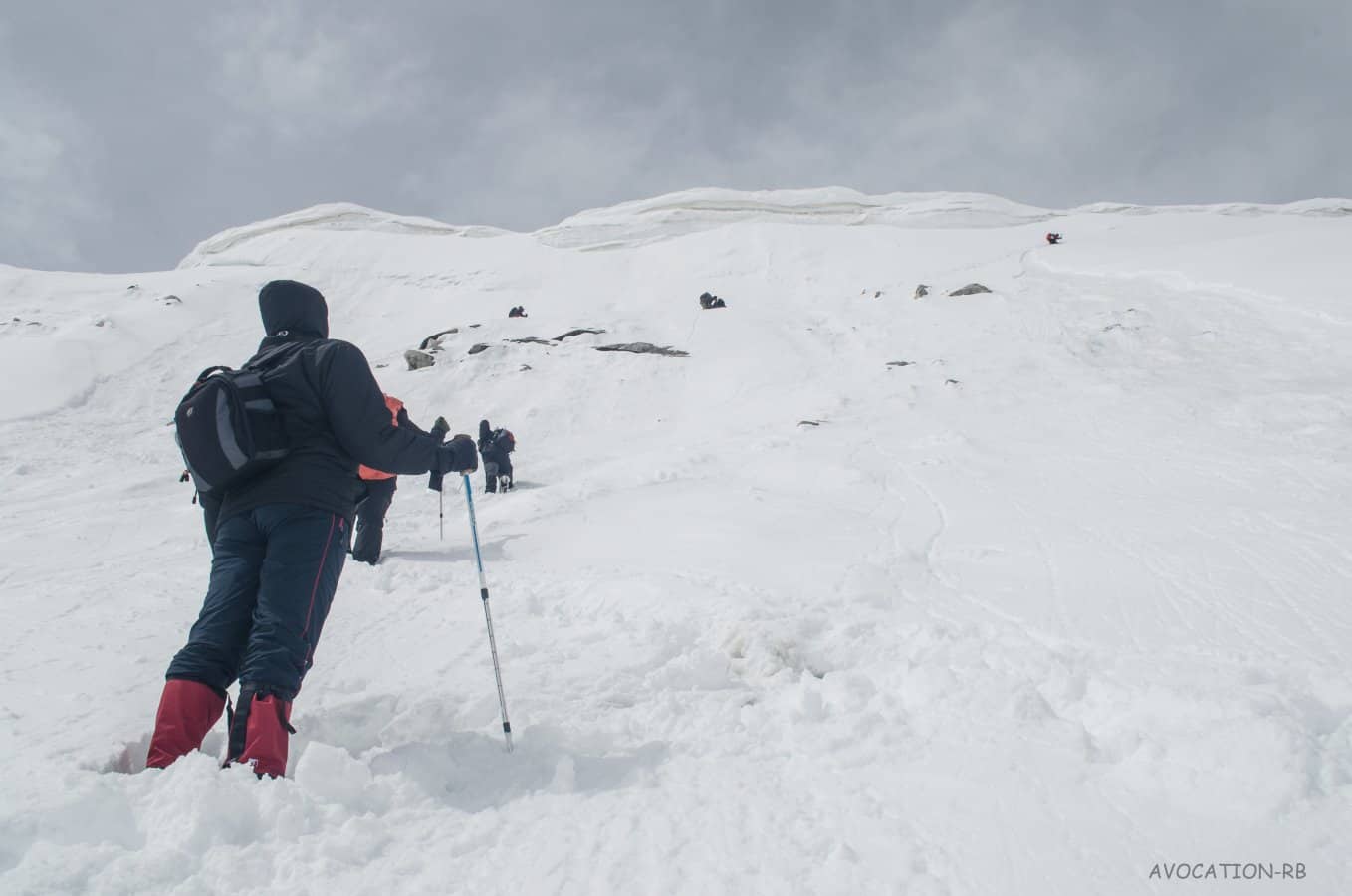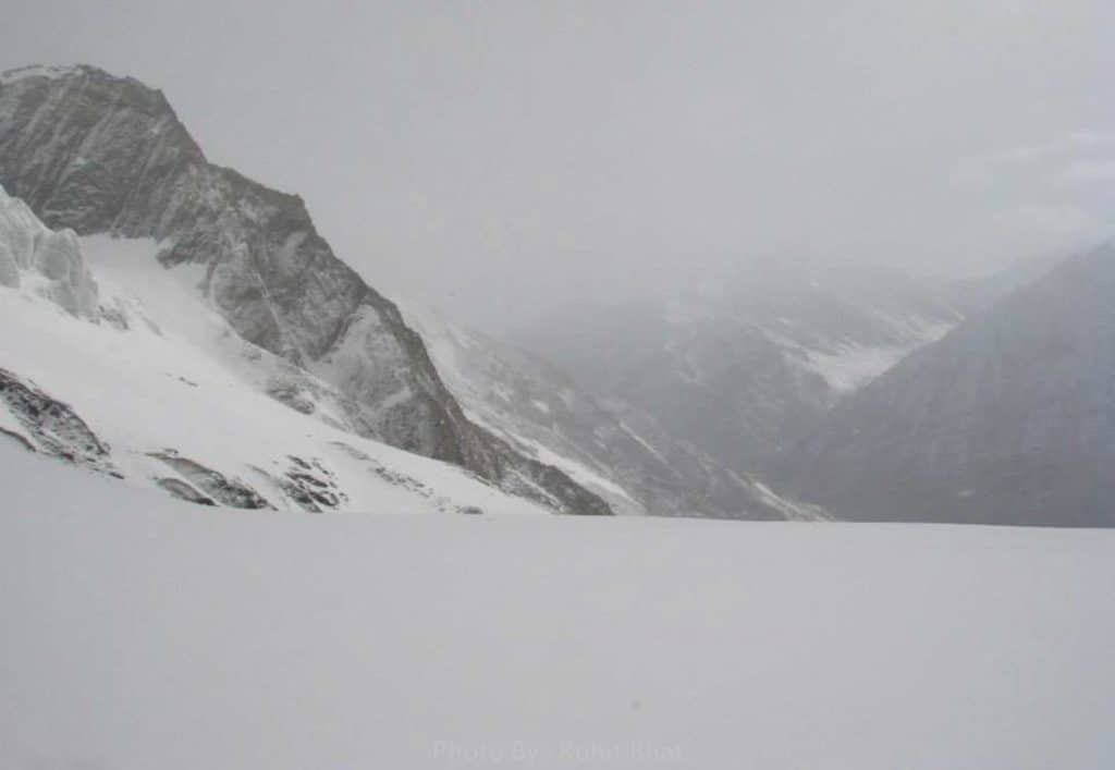 We were already running behind the schedule( say 5 hours time). We started to climb at 4am. It was freezing and the weather was deteriorating again. Rathiji our cook, lead the team members, whereas our guide led the team of porters. In no meantime, all porters overtook us and waited on the snowy slopes.