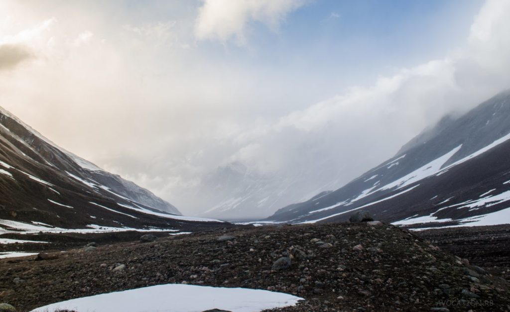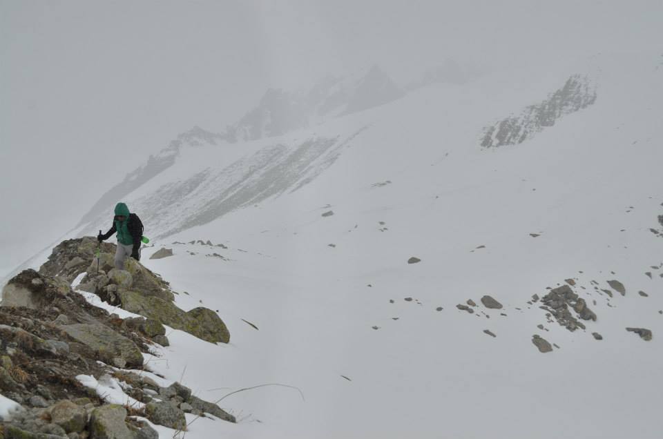 When we woke up at 6 in the morning, it was all white-out outside. Soon, we started discussing on to pass the cross or not. After a lot of arguments, we planned to go ahead. Waiting back did not make any sense. Descending to Chitkul was against our wishes. It was just a matter of 3 hours of the climb to the pass and it descended all the way down to Kyarkoti – Gangnani – Harsil. If anything worse happens within these 3 hours, nobody had an idea to escape it, except our guide Negi. He was confident about it and he leads us in a Pro way. We stood at the top at 9:00 am on 3rd June.
