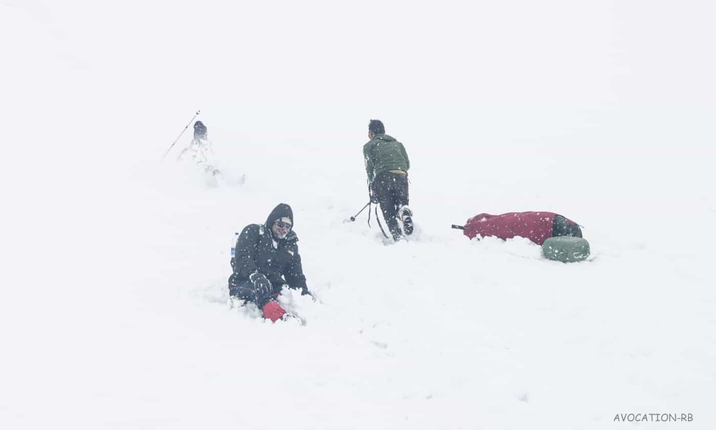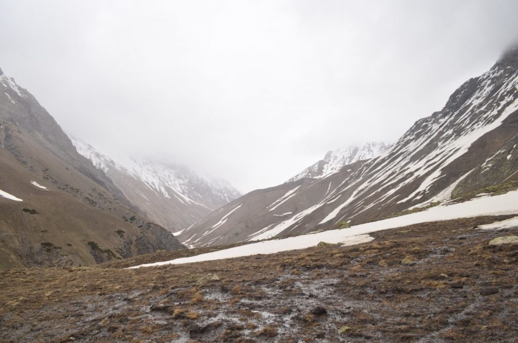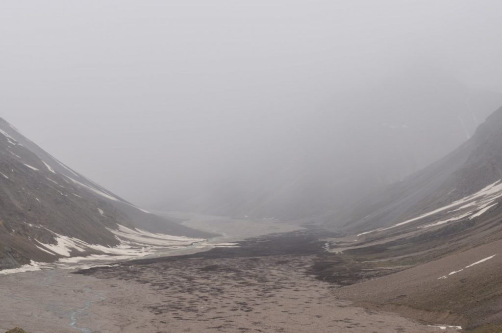 The glissading was fun and risky too. Few members had many rolls, with the bags falling on one side and trekking poles to the others. The weather deteriorated and it was white out. This time, it did not stop for the next 8 hours of daunting descent. There was a huge gap of distance among members, a few of us were climbing down slowly with INFINITE no. of falls and breaking trekking sticks. The plan was to descend until the snowline. We reached Upper Kyarkoti, passing through Sukha Tal at 5:30 pm and threw our bags aside our tents.