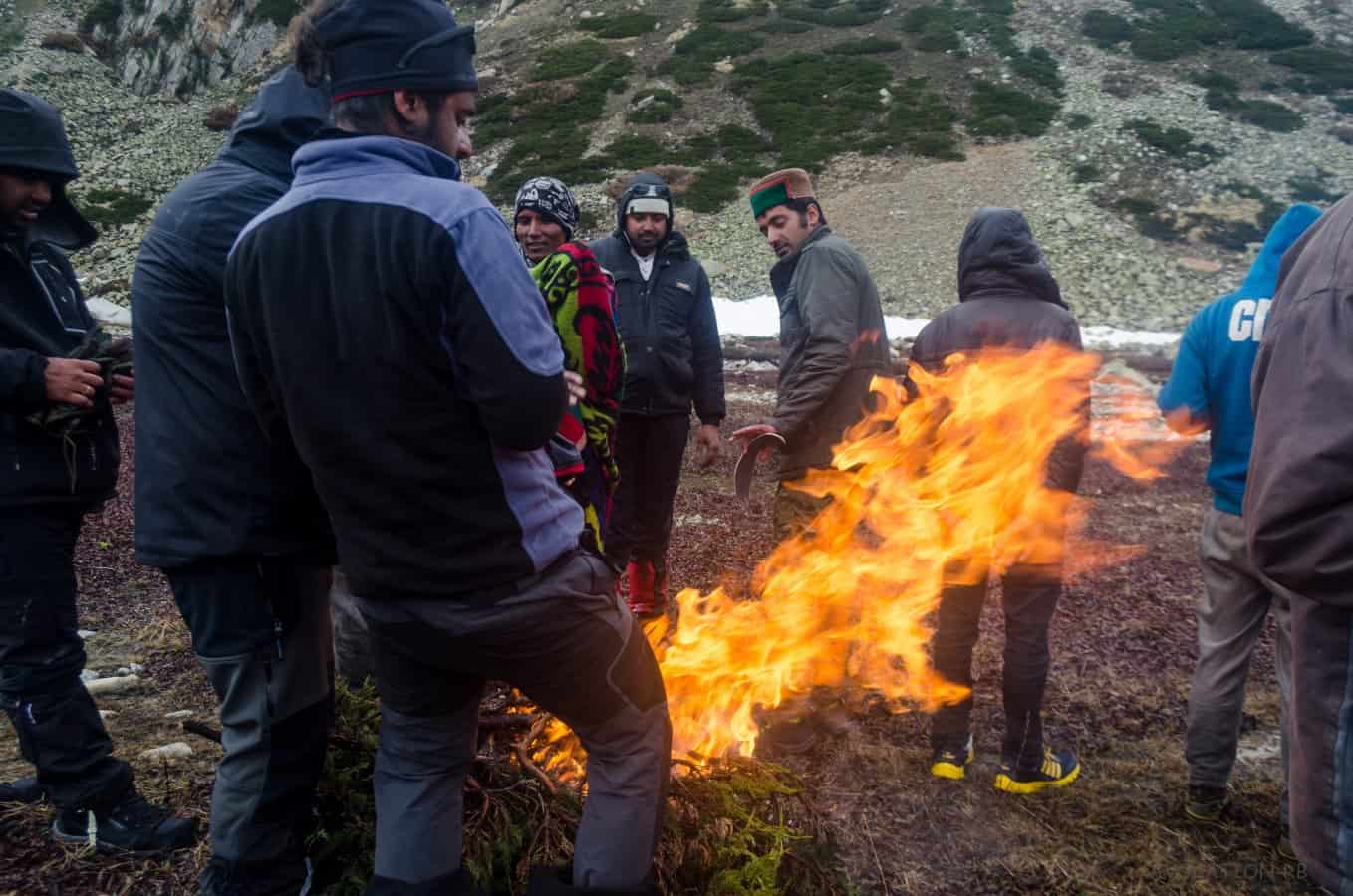 That evening, our porters went hunting some of the juniper bushes/woods for a bonfire. They excelled in getting a large bunch of wet junipers and some wet trunk of the unknown tree which was lying down on high slopes. There was an excitement within the team on the accomplishment of the trek. We sipped many teas that evening, as most of the things were wet and ferocious bonfire by the side.