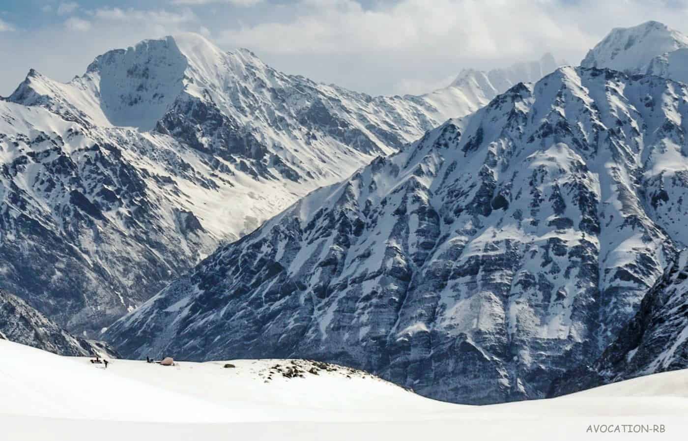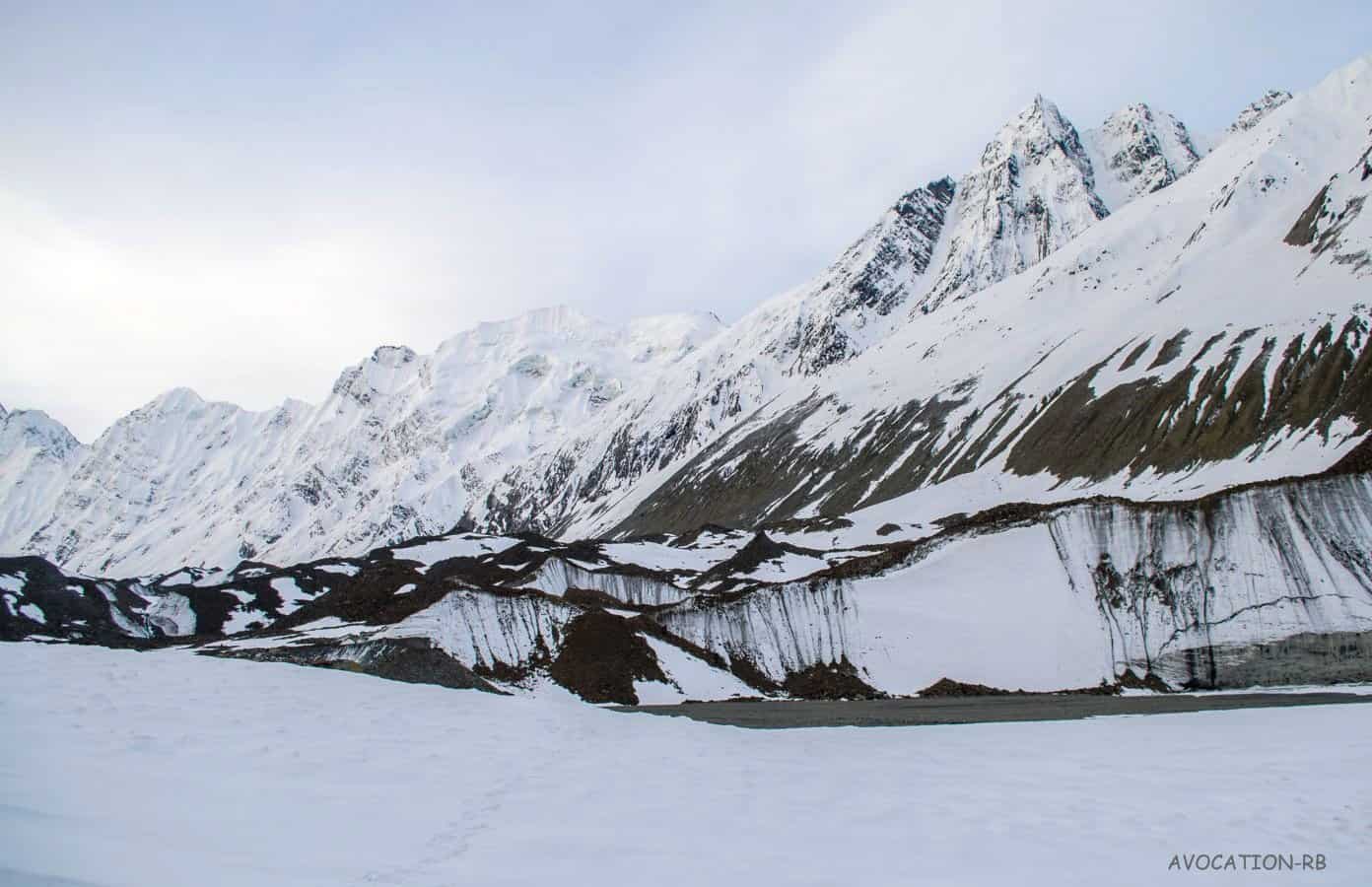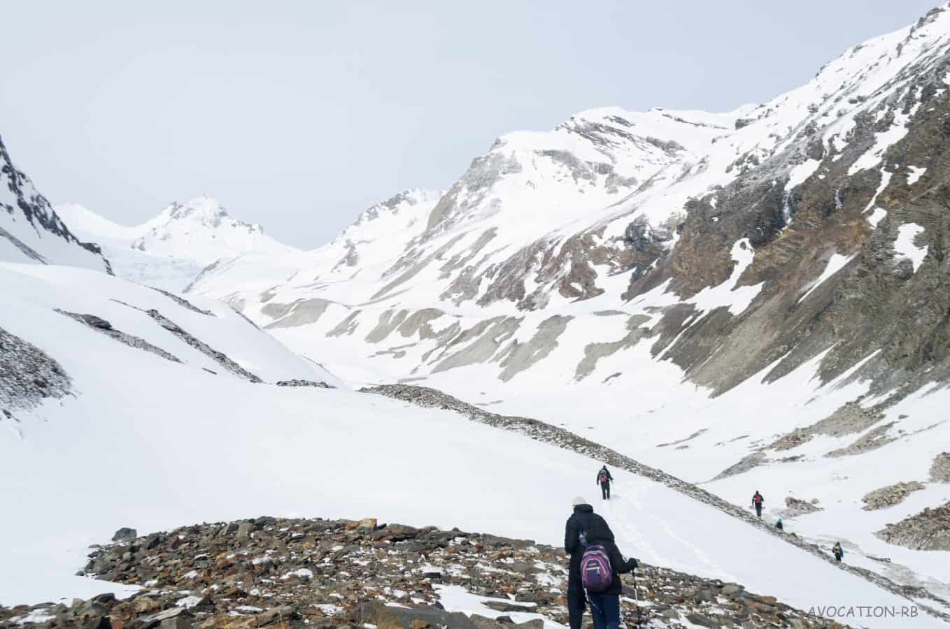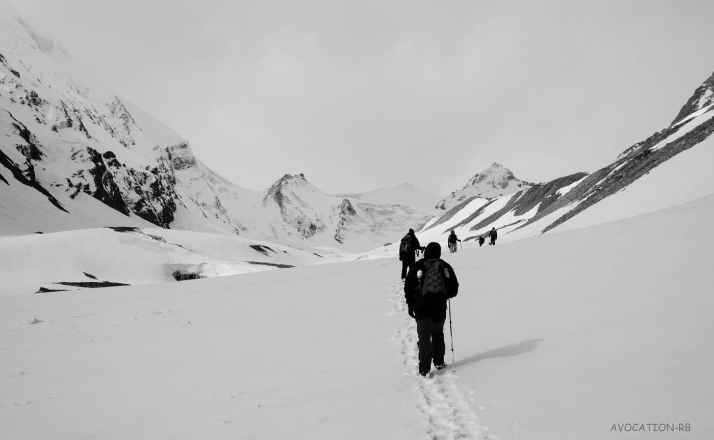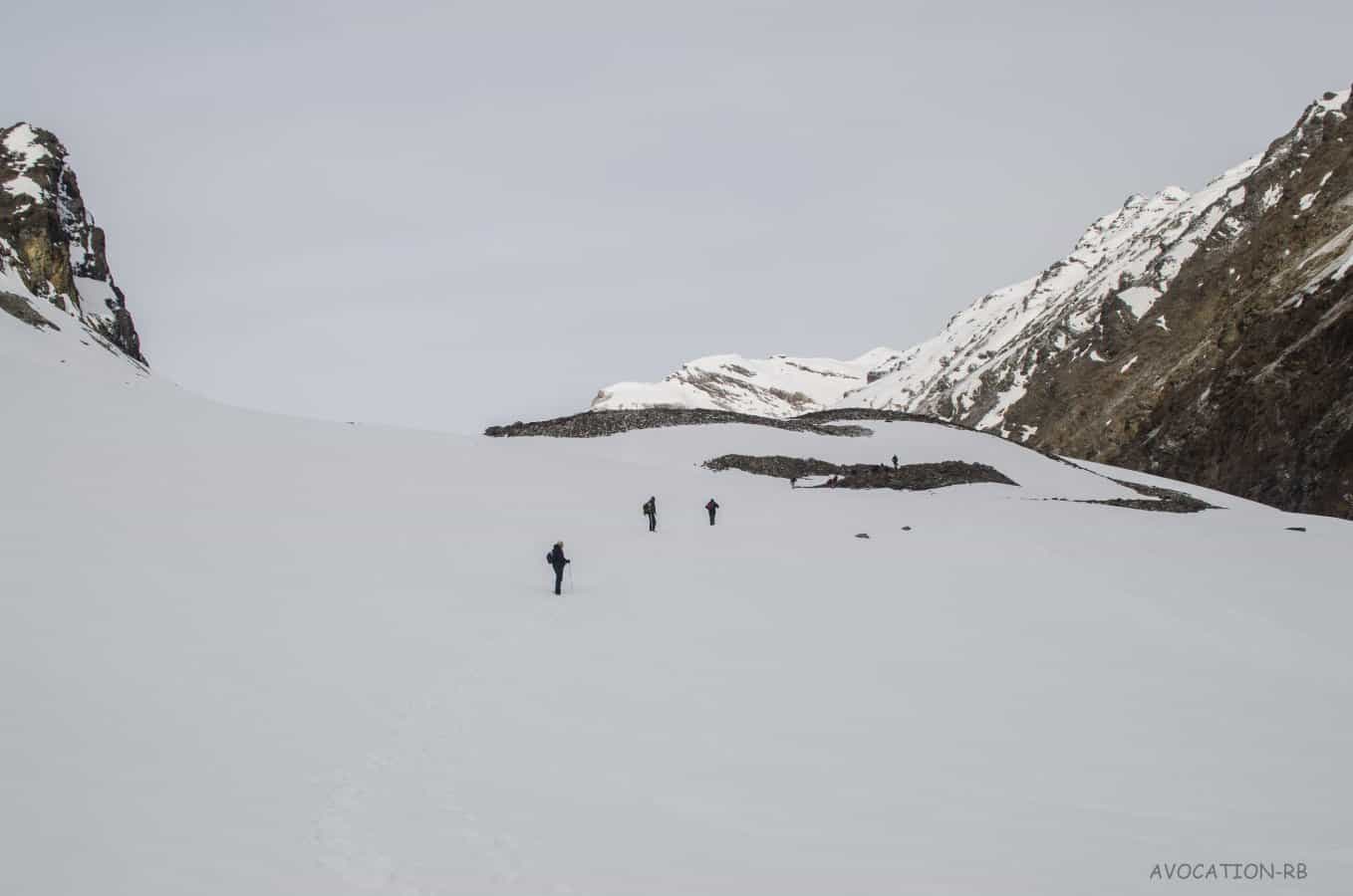 Plan of the day was to reach the Advance Base camp, just below the pass which was 7 hours far from where we were standing on that snowy conditions. We managed to cover it without much headache. Few people were too fast on snow, while others were the opposite of that. Finally, microspikes came into use. There were many steep patches which itself was a task to negotiate, but we managed somehow.