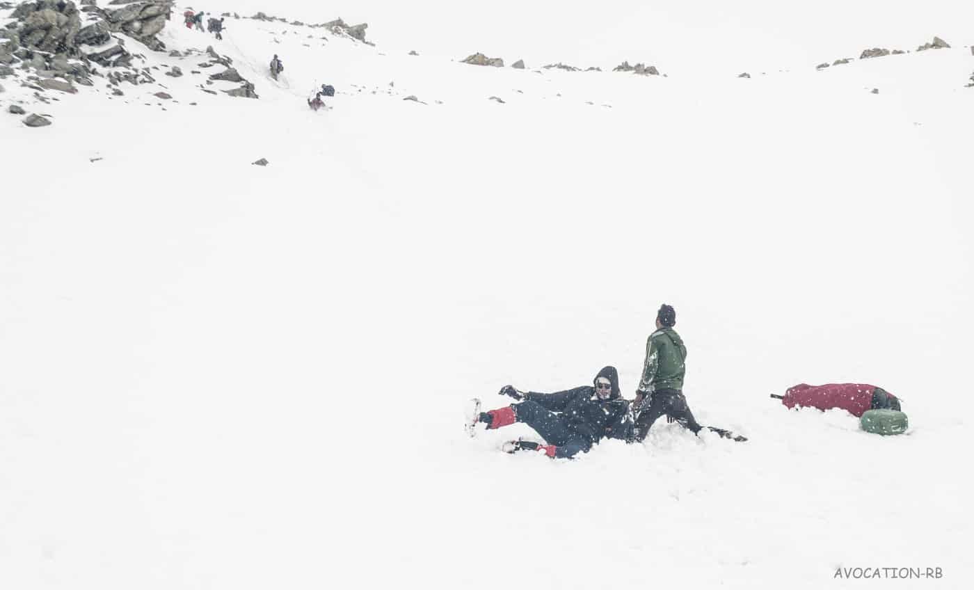 We had to cross the Baspa stream that day. There was an icy and slippery layer on the stones. So balancing on top of stones and crossing would make us fall in the bone freezing water. It took us half an hour to cross it. But Karan fell in the water while helping out RS and she was all fine. It was a funny but frustrating situation. Snowfall increased as we move further, when Negiji finally had to stop. Because going further in that bad weather and pitching tents on glacier camp would be dangerous.