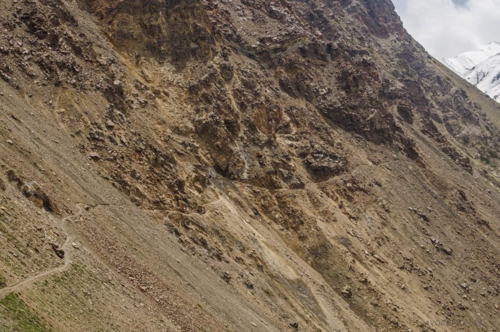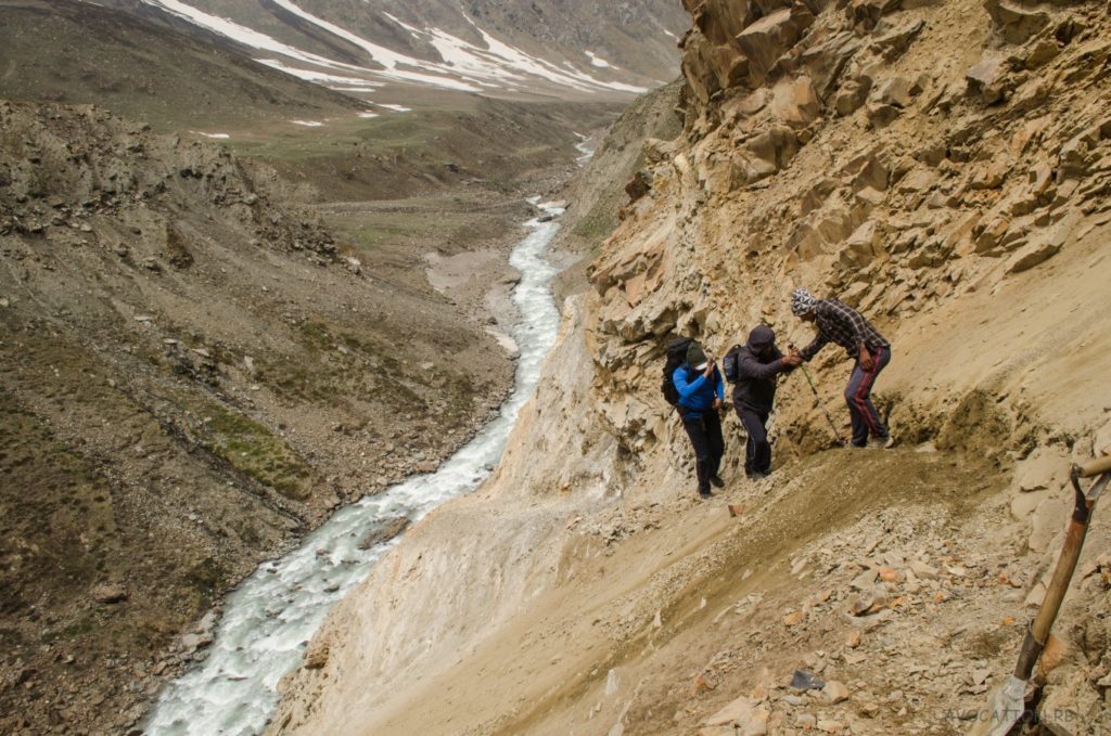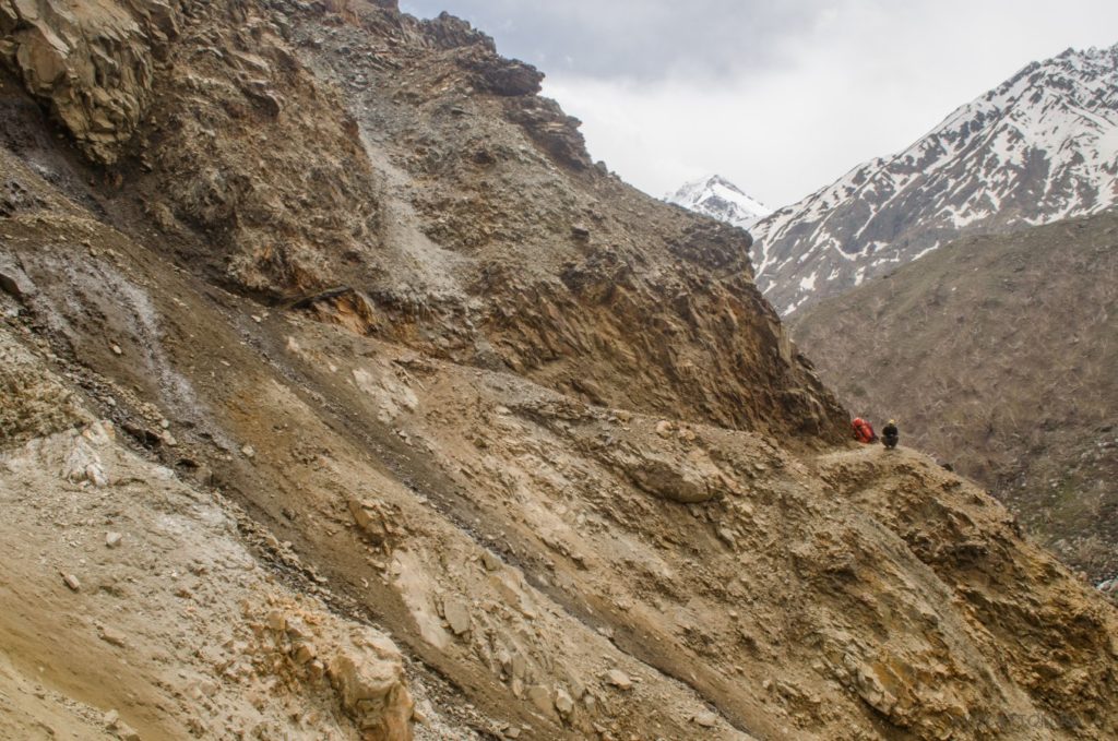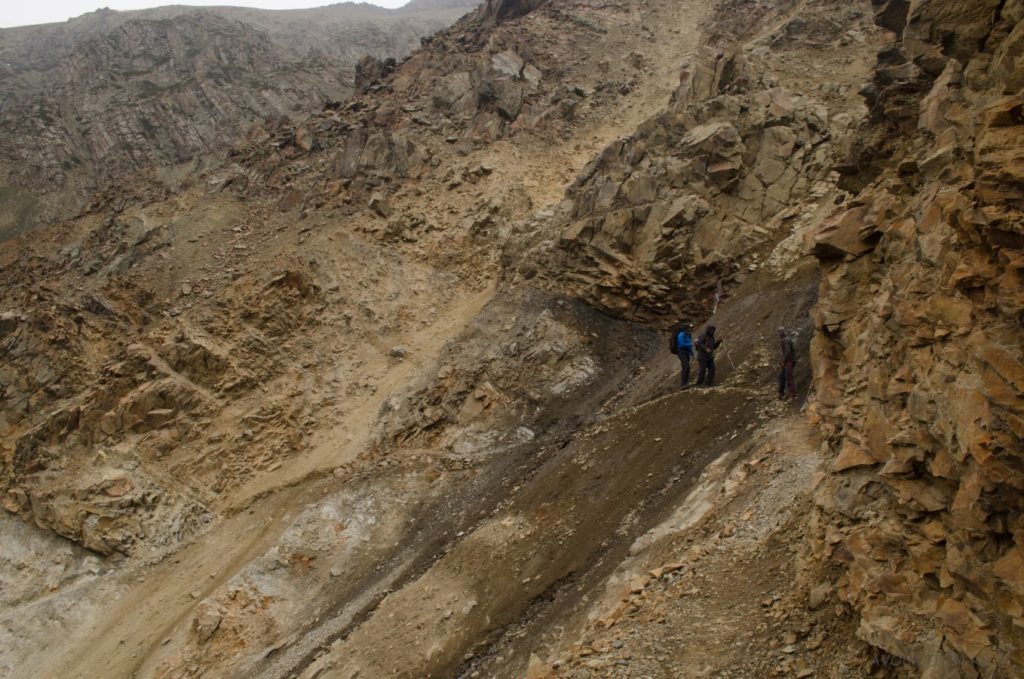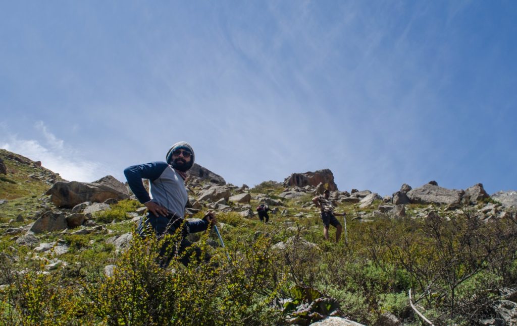 It was a long hike that day going up to 4050m. Though the weather was clear, we had no trust in it either. Soon AP informed us he was having a mild headache but was okay to continue. But from the previous evening, it did not get any better, even after acclimatization walk up to 500ft nearby. He was walking slowly along with few members and porters. He gave up just before Lal Dhang at 10:30 am. His headache remained the same. VB who was walking along with him and me took his heavy rucksack, which he was carrying and in return gave his small camera bag to AP. Meanwhile, our guide Negi saw us from the edge, which was far away on Lal Dhank. He knew something was wrong and waited for us to cross the tricky part. Things were getting serious at that moment.