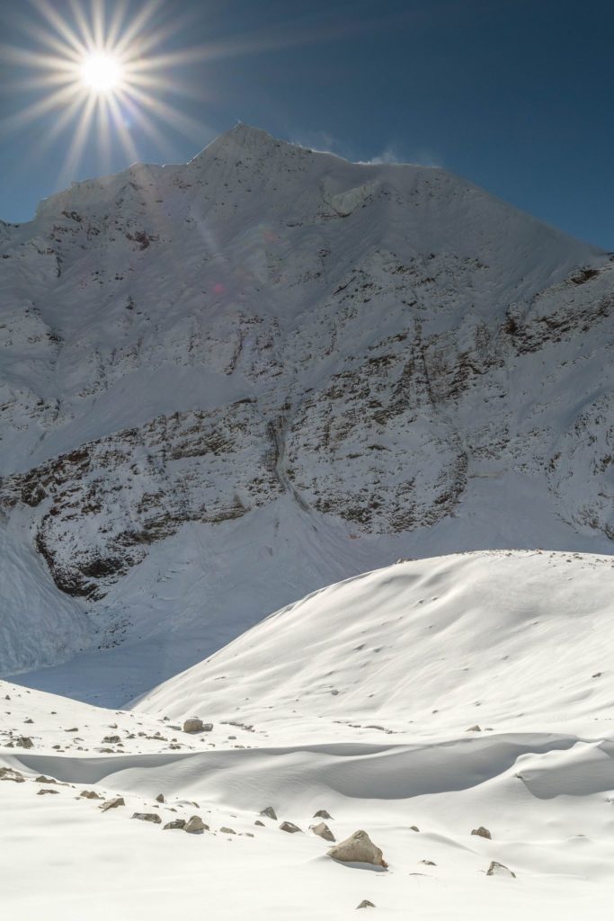 Day of crossing the pass: Probably the photo where you will find the least number of colors. You look around and everything is white. The sun rays above us were a sign of good weather but gave us a decent amount of Burns (coupled with the reflection of snow) which made us look like we just stepped out of a chimney!