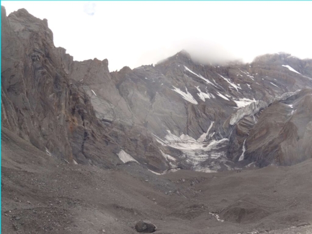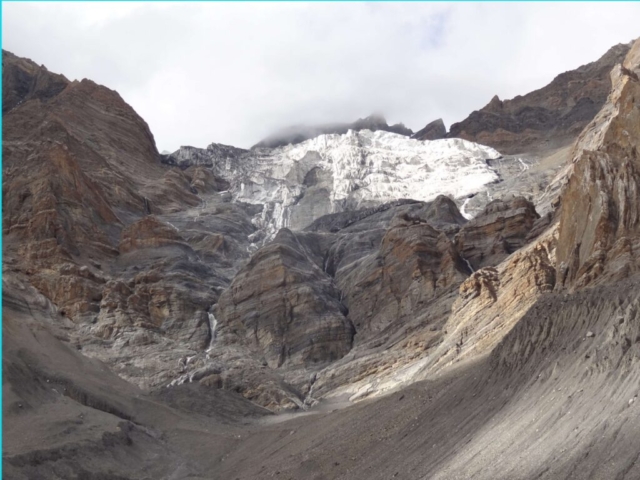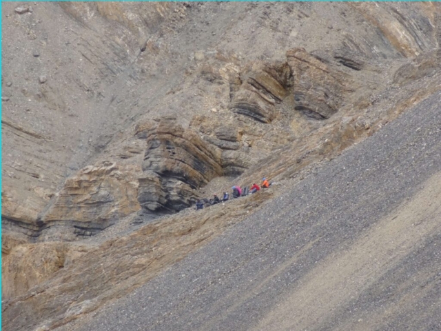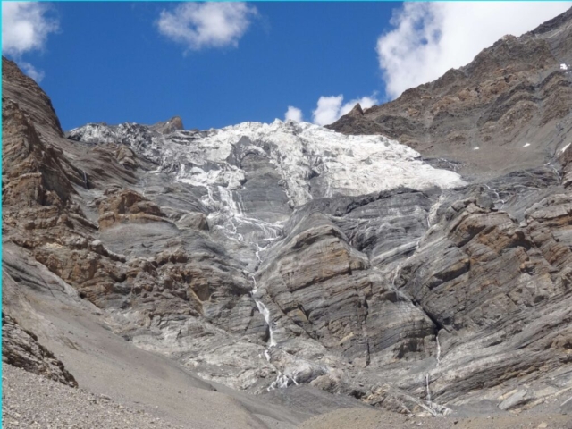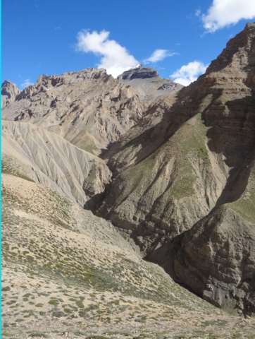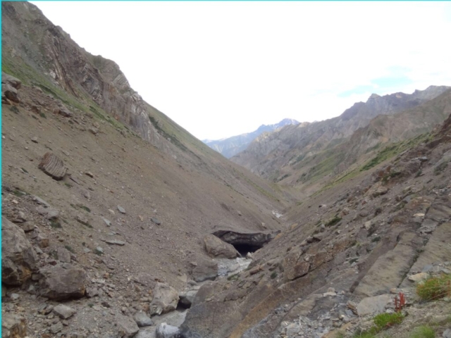 It was a beautiful place with hanging glaciers interspersing the barren mountains. We were hoping for a better route ahead. After lunch, as we walked along the true left of the Sumdo Nala we realized how mistaken we were in our expectation for a better route. There was hardly any route/track to speak of. The sides of the deep valley alongside the Sumdo Nala had been completely wiped away with landslides. One has to traverse through these landslides. The ground was pretty hard (not even shale/scree) and did not offer any proper grip/footing. One slip and a person can easily slide down to the raging Sumdo Nala 60-70M below.