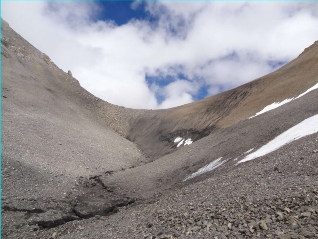 However, the descent from the Manirang pass towards Sumdo Nala (Ropa valley on Kinnaur side) is very steep and fairly risky. The path along the Sumdo Nala, after the descent from the pass, is very dangerous as the route has been washed away in large parts because of flash floods and landslides.