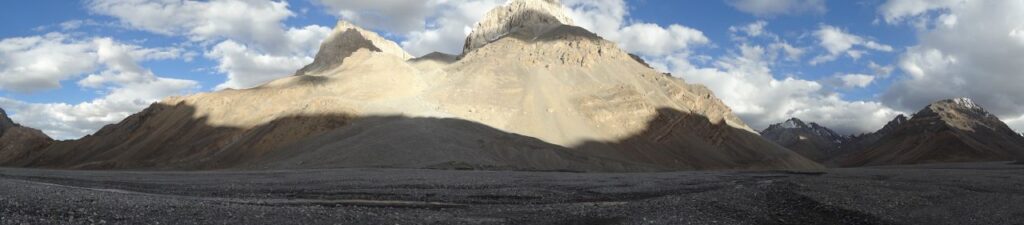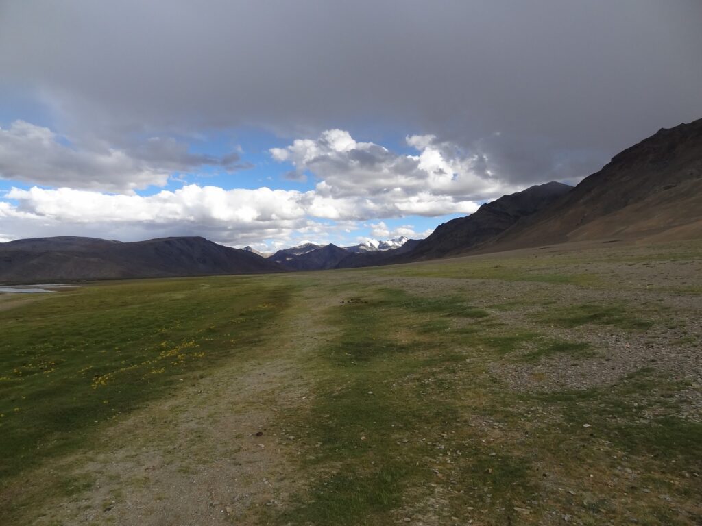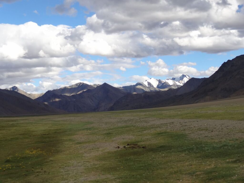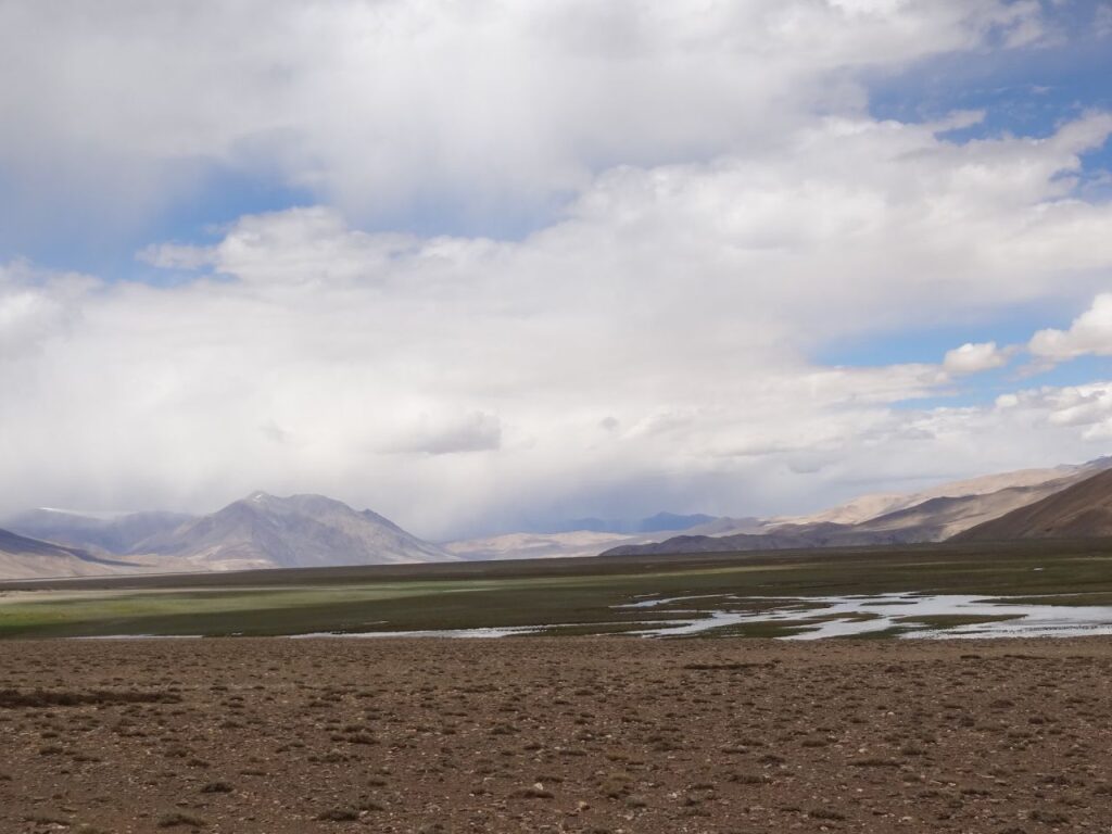 In about an hour we were at the campsite of Chumik Sale. This is where the other group was going to rest. Beyond Chumik Sale the terrain is flat as a pancake and strewn with rocks/pebbles and flanked by mountains on both sides. One can see the silver lining of Tso Moriri lake in the distance.
