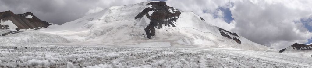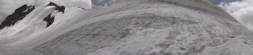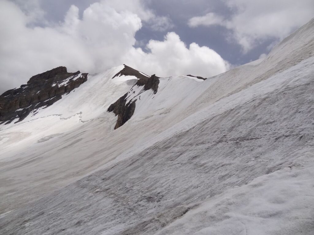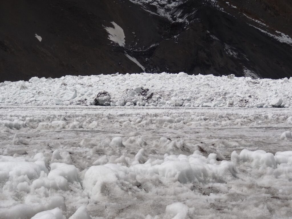 We veered off to the right which was covered with glaciers as we thought we saw a track there. I, later on, saw a track to the left flank, and so we decided to traverse the glacier all the way to the left. Crossing this snow-covered glacier is a dangerous affair. We had to cross the glacier flowing in a fairly wide ice-walled gully.