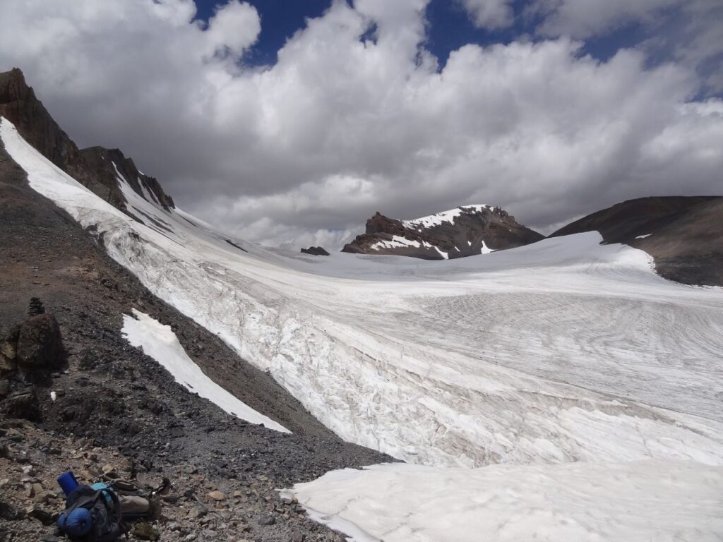 Nevertheless, a burden off my chest, I descended further. The last stretch of the glacier is covered in hard ice and before reaching the rock-strewn area I slithered down several feet on this hard ice.