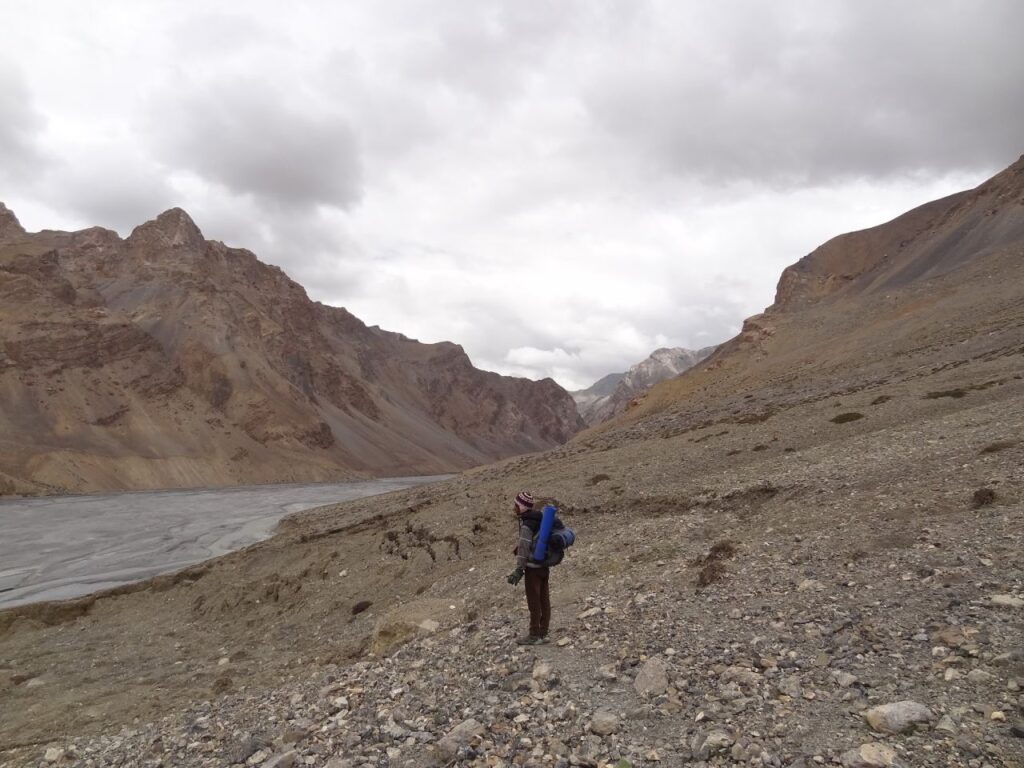 After a couple of hours of walking, the track ascends precipitously high along with the remains of some old glacial moraine. Looking at the terrain and the time we decided that it was highly unlikely that we would find water anywhere above so we filled about 3.5 liters of water in the river and started the tiring ascent, with the additional 3.5 kg weight.