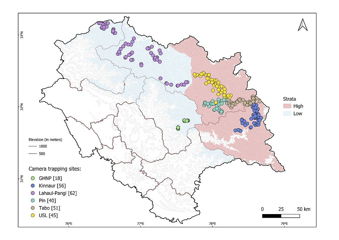 - Low strata region: regions of low snow leopard population/occupancy density, i.e. Great Himalayan National Park (GHNP) Kullu, Lahaul and Pangi region of Chamba.