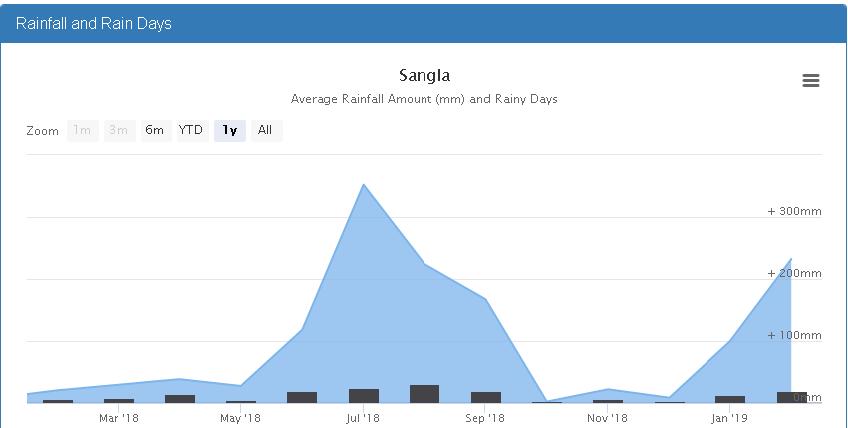 Sangla Valley experiences a temperate and dry climate, though the valley receives more rain than the rest of the regions located in upper Kinnaur, i.e. Sairag, Jangramang, Tirung and Ropa and Hangrang valleys or Kinnaur. It receives highest rainfall in July and August Month.