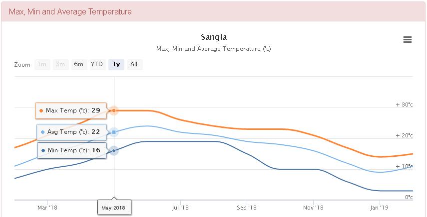 Sangla valley is located in the temperate zone. The average yearly temperature of Sangla hovers around 17 °C. It peaks in the months of May and June when it reaches 30 °C, but the weather remains pleasant.